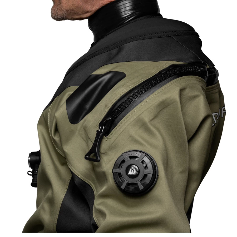Comme la D3 est dérivée d’une combinaison militaire, elle est conçue pour une mobilité et un contrôle sans restriction, à la fois au-dessus et au-dessous de la surface. C’est pourquoi elle a une coupe plus fine autour du torse et des jambes pour réduire la traînée et les mouvements d’air inutiles, ce qui améliore le contrôle. La D3 a encore un peu plus d’espace autour des épaules pour améliorer la mobilité dans cette zone. Grâce à l’emplacement de la fermeture éclair et au tissu tri-lam très doux, il n’y a littéralement aucune restriction de mouvement.